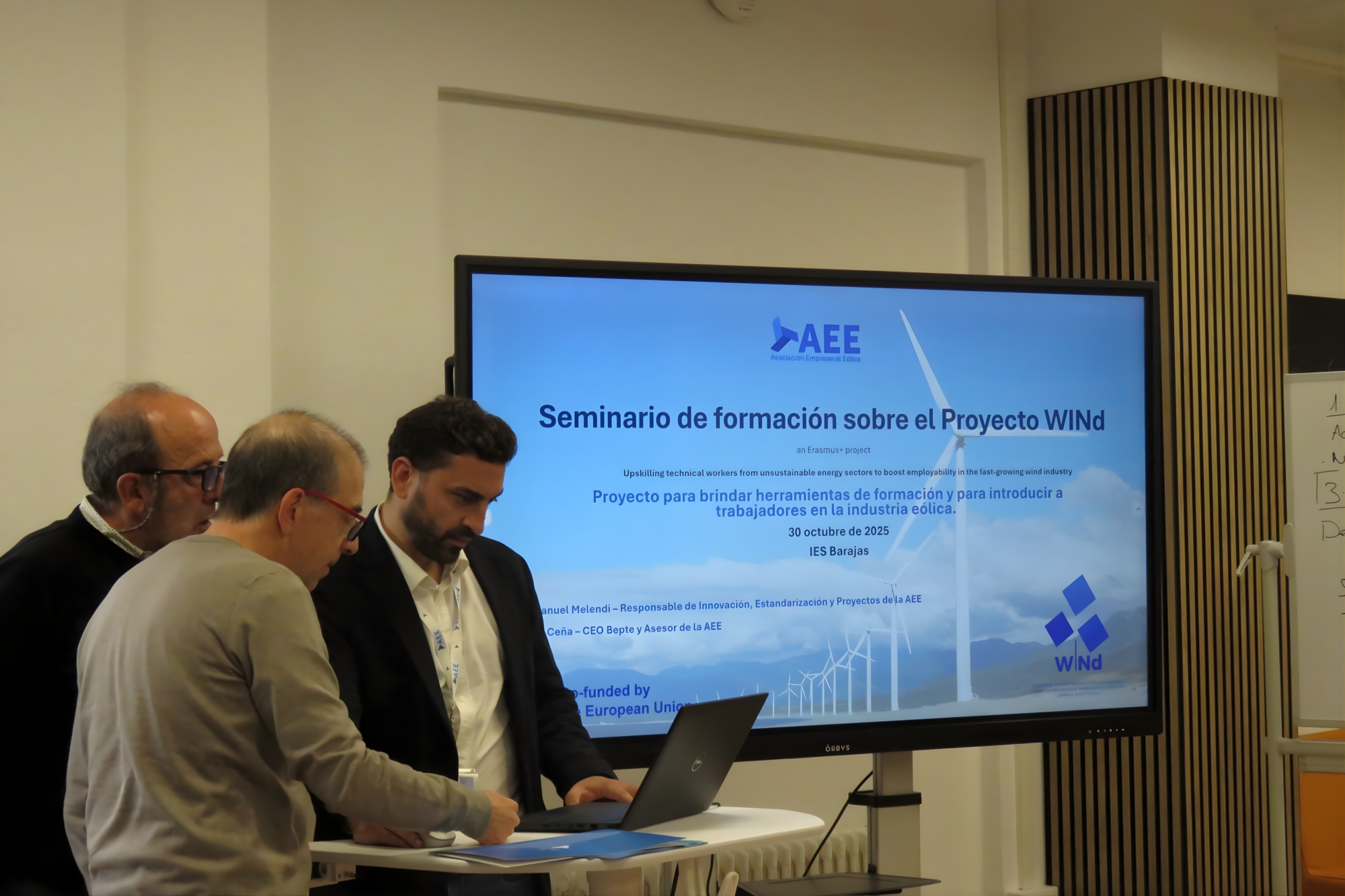 On 30 October 2025, the Asociación Empresarial Eólica (AEE) hosted a WINd Training Seminar at the Entrepreneurship Room of IES Barajas, in Madrid, Spain. The session introduced participants to the WINd curriculum, the Massive Open Online Course (MOOC), and the WINd mobile application, highlighting their role in supporting flexible and industry-relevant learning.